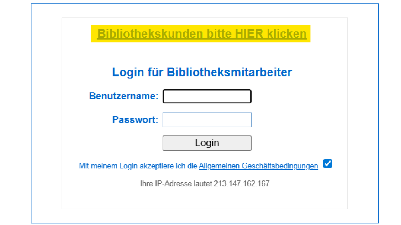 Wie gewohnt über den Online Katalog einsteigen. Oberhalb des Login für Bibliotheksmitarbeiter die graue Zeile - "Bibliothekskunden bitte HIER klicken"- anklicken.